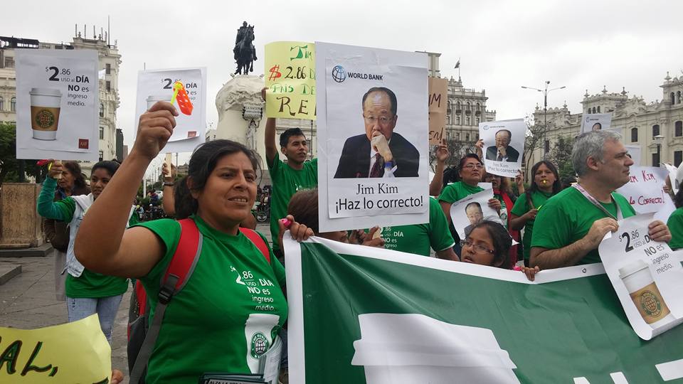 Lima, Perú .- Una singular protesta, realizó un grupo de activistas en derechos humanos, quienes se apostaron cerca de la sede donde se realizan las Reuniones Anuales de las Juntas de Gobernadores del Grupo del Banco Mundial (BM) y del Fondo Monetario Internacional (FMI), para solicitar al presidente del BM Jim Yong Kim cambios en los parámetros de clasificación de los países con ingresos de renta media.