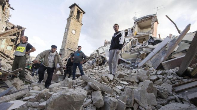 Amatrice, una de las localidades más afectadas, está devastada. Continúan las labores de rescate, en las que participan militares, Carabinieri, patrullas de montaña y personal sanitario. Los equipos cuentan también con perros rastreadores que intentan encontrar con vida a personas bajo montañas de escombros, algunas de hasta una decena de metros. A la entrada se ha instalado un hospital de campaña, aunque los heridos más graves se han trasladado a los hospitales más cercanos. Un señor llama por teléfono desde debajo de los escombros diez horas después del derrumbe. Perros rastreadores trabajan para encontrarlo. Silencio total, con la esperanza de poder localizarlo.