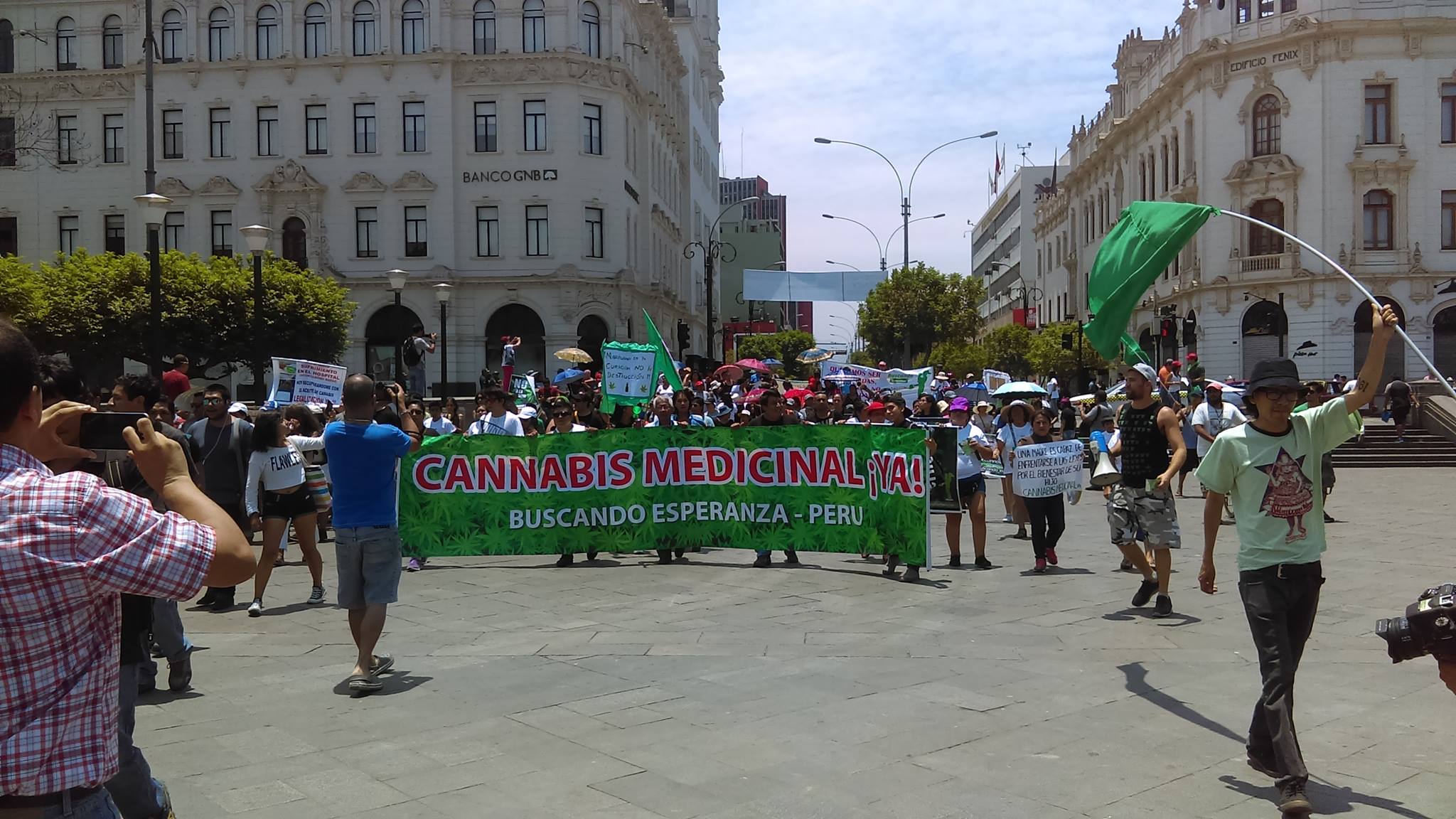 Lima, Perú.- Integrantes del colectivo Buscando Esperanzas Perú, que promueve la legalización de la marihuana para uso medicinal, realizan una marcha para solicitar a las autoridades el uso del cannabis para aliviar los dolores de cientos de personas que sufren epilepsias y enfermedades crónicas.