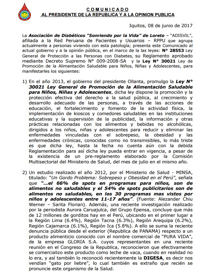 Lima, Perú.- «¿Será que los grandes intereses de las industria alimentaria nacional y extranjera están por encima de la salud de los 33 millones de peruanos y peruanas?, ¿Qué está esperando este gobierno, que sigan ocurriendo más hechos vergonzosos como el ocurrido en el caso de Pura Vida?, acaso quieren se incremente más la tasa de pacientes con enfermedades crónicas no transmisibles, como diabetes, cáncer, entre otras enfermedades», son parte de las preguntas y preocupaciones que han puesto de manifiesto la Asociación de Diabéticos “Sonriendo por la Vida” de Loreto – “ADISVIL”, afiliada a la Red Peruana de Pacientes y Usuarios en un comunicado a la opinión pública.