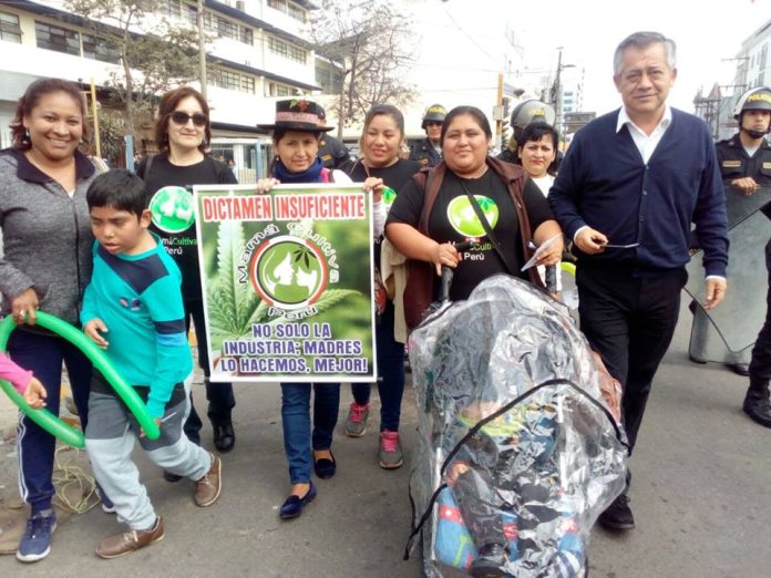 Lima, Perú.-Cientos de personas, entre adultos y menores, marchan esta tarde por diversas calles del Cercado de Lima para pedir la aprobación del proyecto de ley que autoriza el uso de la marihuana con fines medicinales a favor de pacientes con enfermedades crónicas.