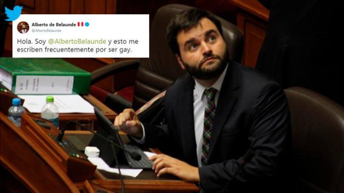“Hola. Soy Alberto de Belaunde y esto me escriben frecuentemente por ser gay”, retuiteó el legislador de un comentario con agravios que un usuario identificado como “Elvis Idrogo” realizó sobre su sexualidad.