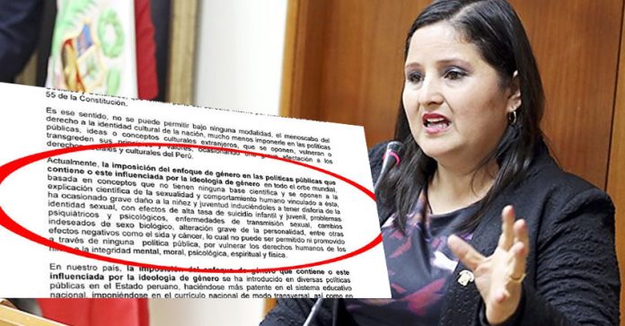 Según el texto de la propuesta de ley, «La imposición del enfoque de género en las políticas públicas que contiene o esté influenciada por la ideología de género en todo el orbe mundial, basada en conceptos que no tiene ninguna base científica y se oponen a la explicación científica de la sexualidad y comportamiento humano vinculado a esta , ha ocasionado grave daño a la niñez y juventud induciéndoles a tener (…) entre otros efectos negativos como el sida y cáncer».