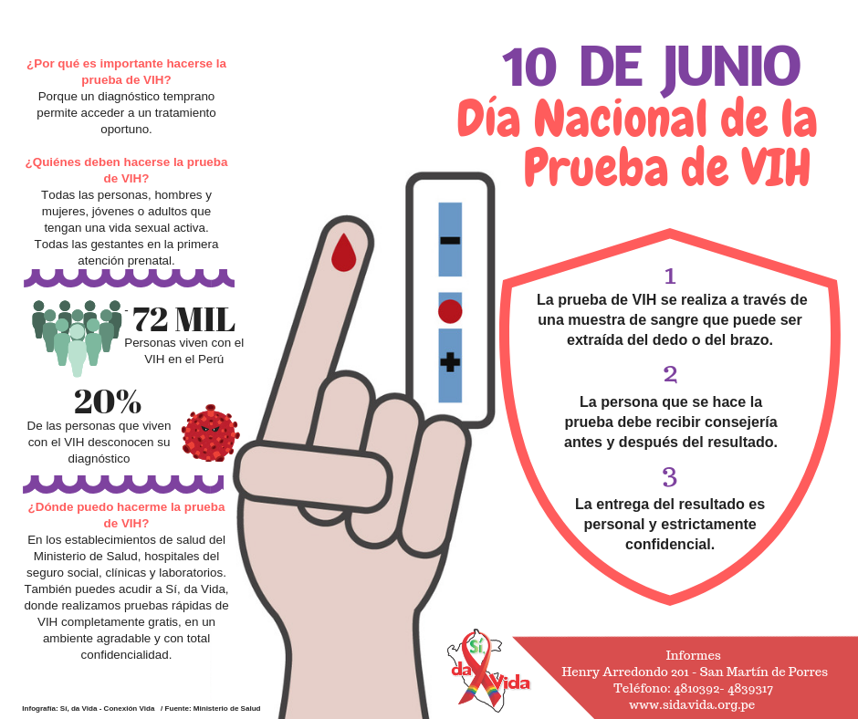 Lima, Perú.- Para conmemorar el Día Nacional de la Prueba para VIH, la ONG Sí, da Vida ofrecerá, este lunes 10 de junio, pruebas gratuitas para todas las personas mayores de edad que deseen descartar la presencia del virus del VIH en su organismo. Las atenciones en tamizaje se brindarán de 8:30 am a 12:30 del mediodía en las instalaciones de Sí da Vida, en la calle Henry Arredondo 201, San Martín de Porres (frente a la puerta 5 de la UNI).