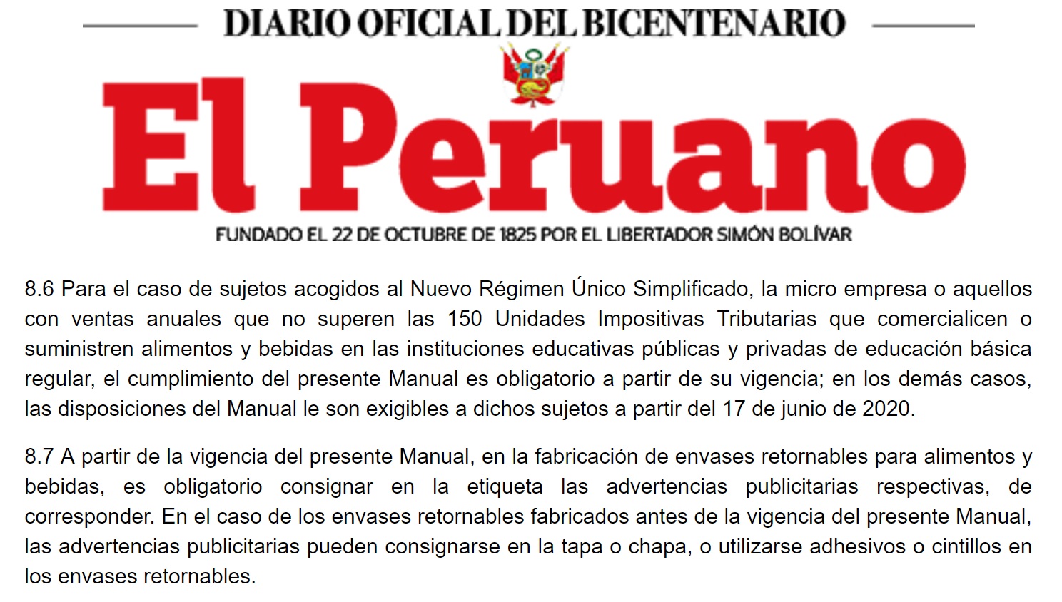 Lima, Perú.- Si usted creía que a partir de hoy, podría adquirir algún producto alimenticio procesado, con la información octogonal, que señala si un producto es alto en grasas saturadas, grasas trans,  azúcar y sodio (sal) como dicta la norma, pues ha caído en error producto de las modificaciones que ha sufrido la norma en las ultimas horas.  El gobierno por medio del Ministerio de Salud publicó 48 horas de iniciar el plazo de obligatoriedad del etiquetado octogonal el Decreto Supremo N° 015-2019-SA que modifica arbitraria y sustancialmente diversas normas del Reglamento de la Ley N° 30021 – Ley de Promoción de la Alimentación Saludable para niños, niñas y adolescentes, aprobado por Decreto Supremo N° 017-2017-SA y del Manual de Advertencias Publicitarias aprobado por el Decreto Supremo N° 012-2018-SA.