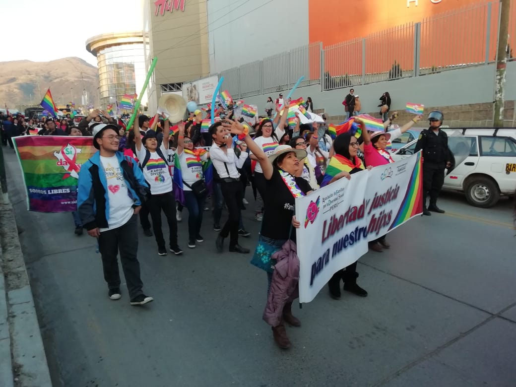 Huancayo, Perú.- Cientos de personas, con banderas multicolores marcharon, el sábado por el centro de la ciudad de Huancayo, para celebrar, por primera vez en su historia, la marcha del orgullo de personas Lesbianas, Gays, Trans, Bisexuales e Intersexuales (LGBTI) en la región. Los manifestantes, a viva voz, exigían igualdad de derechos, así como el fin de la discriminación para los integrantes de la comunidad LGTBI.