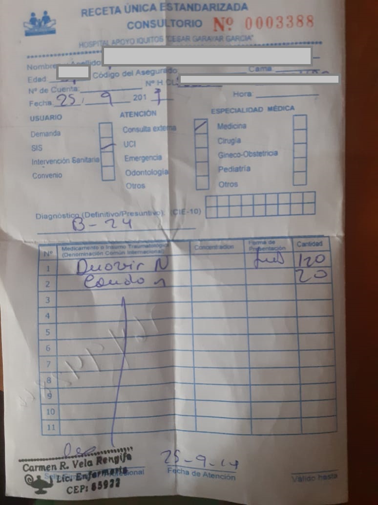 Quien se resiste a la otra opción responde al nombre de Hernán y consume duovir-N desde, también, hace trece años para mantener a raya al VIH presente en su cuerpo. El 25 de setiembre último, en la ventanilla de la farmacia del Hospital Apoyo de Iquitos –perteneciente al MINSA– le avisaron que no se contaba con su medicamento y le prometieron entregárselo una semana después.