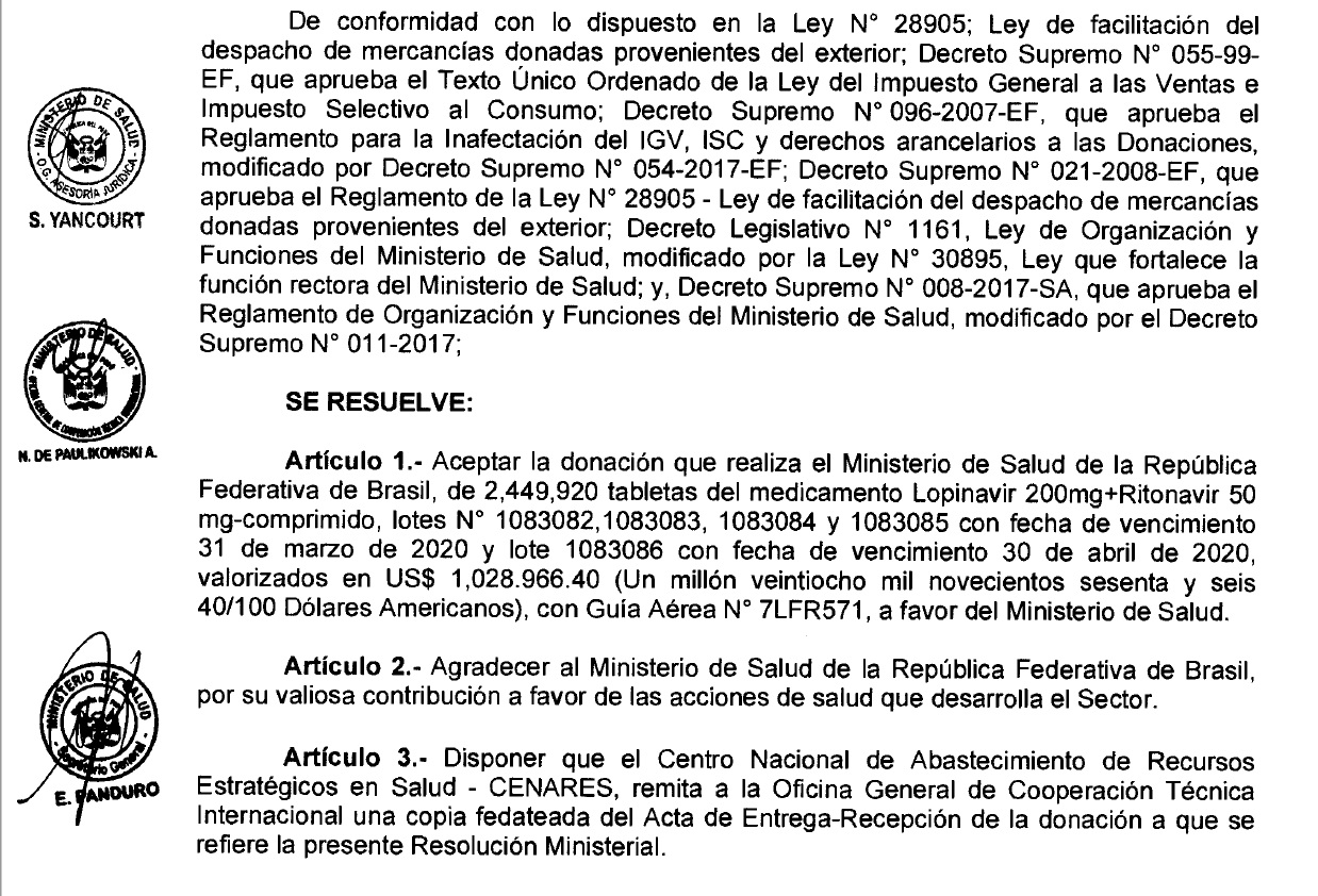 De acuerdo con la Resolución Ministerial N° 987-2019, la ministra Zulema Tomás, aceptó recibir varios lotes de kaletra, ante un serio desabastecimiento de medicamentos que mantuvo sin medicación a cientos de pacientes y usuarios a finales del mes de agosto, a la quincena del mes de octubre.