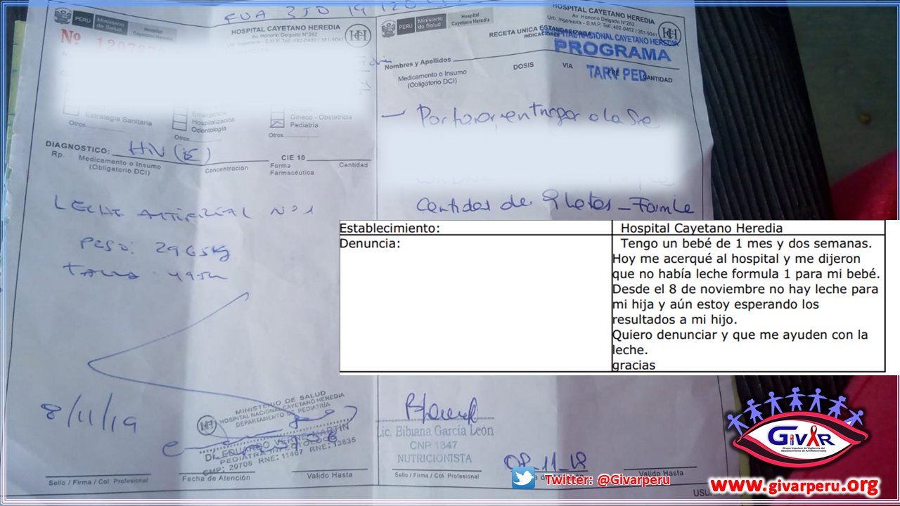 La capital también reporta quejas. Desde el 8 de noviembre, la madre de un bebé de mes y medio de edad que se atiende el hospital Cayetano Heredia de Lima no recibe la leche fórmula 1 que debe recibir de acuerdo a la norma técnica. La respuesta del Ministerio es que tendrá que esperar hasta 15 días, para que se le entregué el producto al lactante quien, por razones de seguridad, está impedida de alimentarse del pecho de su madre que vive con VIH.
