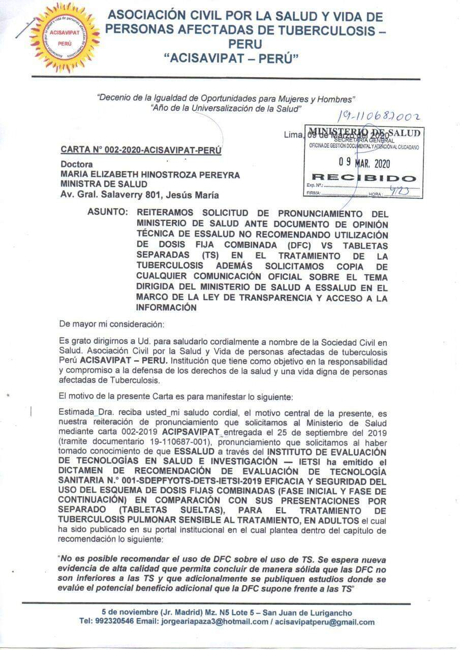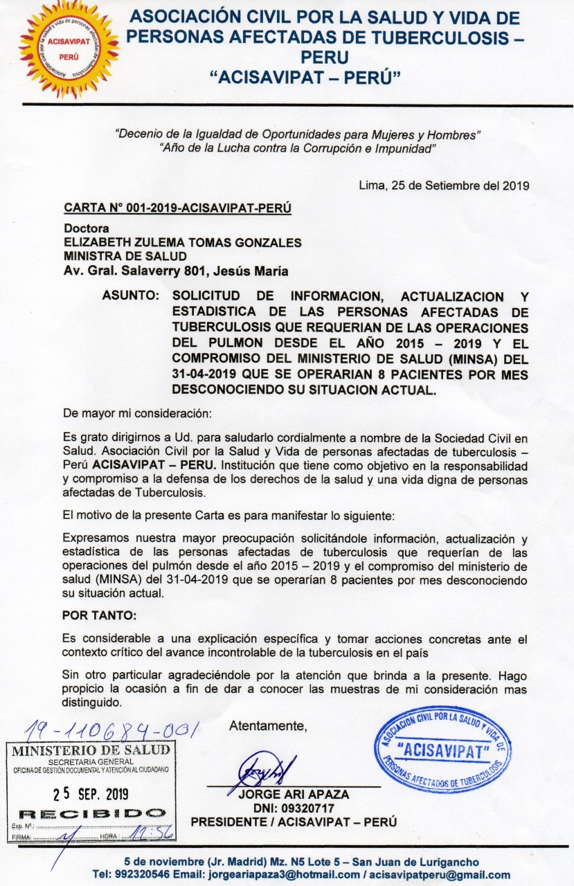 El activista relató a Conexión Vida que, ante meses de falta de información sobre el número de casos de operados en el Hospital Unanue, la Asociación Civil por la Salud y la Vida de las Personas afectadas de Tuberculosis envió el 25 de setiembre de 2019, una carta dirigida a la ministra de Salud de ese entonces, Zulema Tomas, en la cual solicitaban dicha información para confirmar si el MINSA estaba cumpliendo con su compromiso de operar a ocho personas al mes en esas instalaciones. Nunca recibieron respuesta.