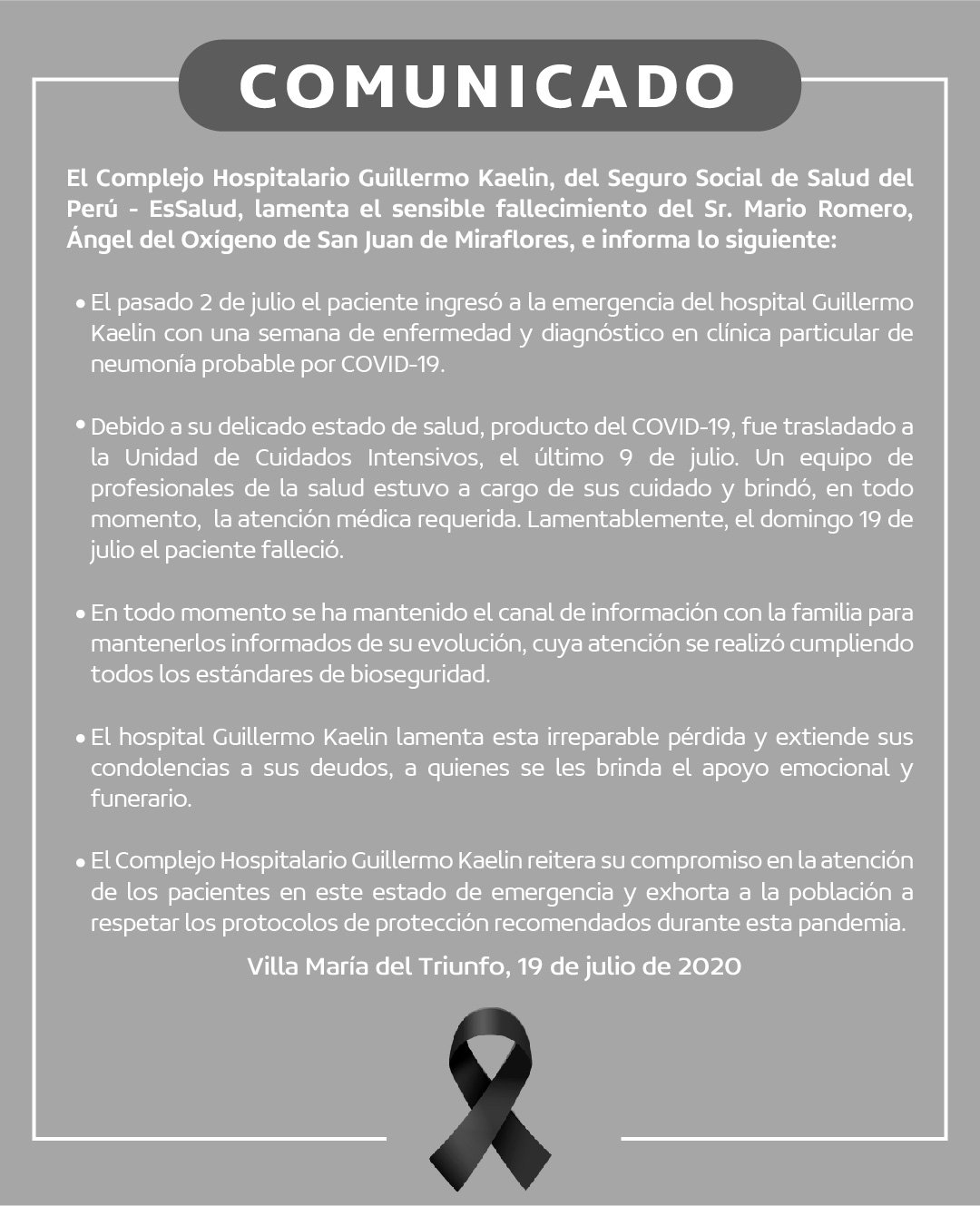 Mediante un comunicado, señaló que el empresario ingreso el 2 de julio a la emergencia del nosocomio, ubicado en Villa María del Triunfo, con una semana de enfermedad y diagnóstico en clínica particular de neumonía probable por covid-19.