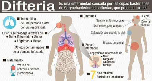 La difteria es una enfermedad infectocontagiosa aguda producida por el Corynebacterium diphteriae, que se caracteriza por la aparición de manchas blanquecinas en la garganta, faringe, laringe o nariz, que se extienden rápidamente y forman membranas que impiden el paso del aire a los pulmones.