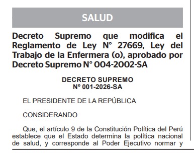 Lima – Perú.- A partir de este 2026, las enfermeras y enfermeros del país podrán abrir consultorios privados, tras la entrada en vigencia del Decreto Supremo N.º 001-2026-SA, publicado en el diario oficial El Peruano. La medida, impulsada por el Ministerio de Salud, modifica el reglamento de la Ley N.º 27669, Ley del Trabajo de la Enfermera(o) y amplía formalmente el campo de acción de estos profesionales dentro del sistema sanitario peruano.